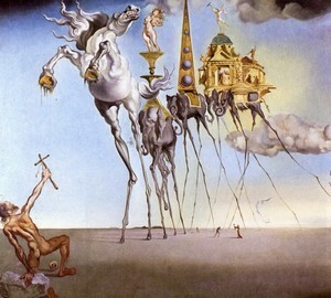 Слоны, которые обычно ассоциируются с властью и силой, у Дали передвигаются на тонких и хрупких длинных ногах. В таком виде слон для Дали становится символом контраста прочности и хрупкости, прошлого и современности.