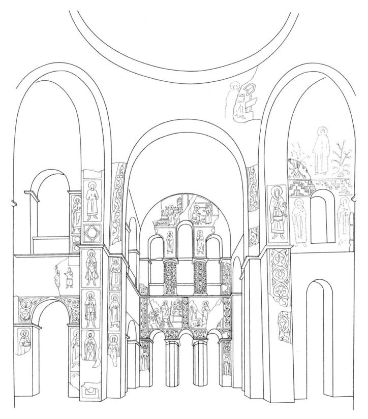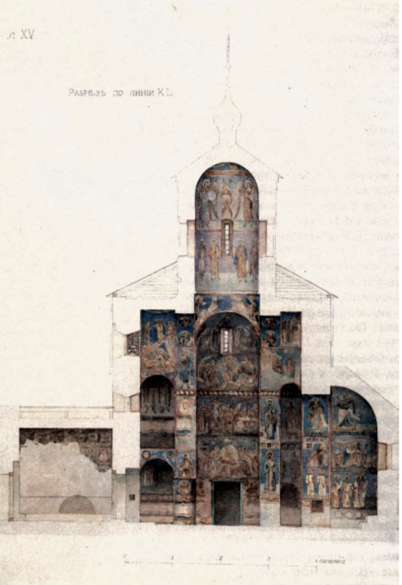 Внутри древнерусский храм украшали не только иконами, но и настенными росписями, которые изображали ангелов, святых и сцены из жизни Христа.