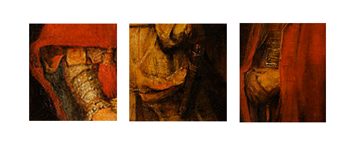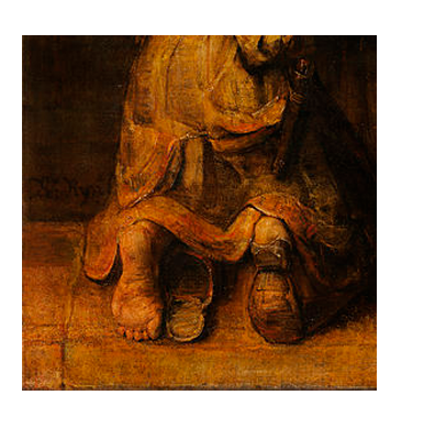 Картины Рембрандта были известны своей реалистичностью. Художник достигал такого эффекта благодаря деталям, которые он подсматривал, наблюдая за жизнью горожан и бедняков. Взгляните, например, на стоптанные башмаки главного героя. Они спадают с ног, и это создаёт впечатление, будто герой только что рухнул на колени. Кроме того, мы видим, что это некогда хорошие и дорогие башмаки, которые после долгого и сложного пути героя стоптались и испортились. Это же произошло и с одеждами персонажа. Все эти мелочи отчётливо указывают нам на социальное и иэкономическое положение героя.
